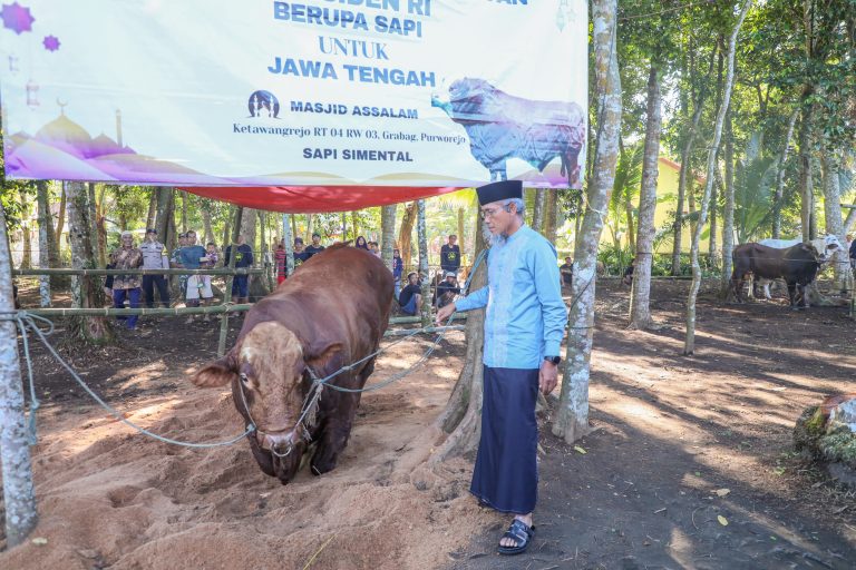 PURWOREJO – Sebanyak 36 sapi kurban Presiden RI diserahkan di seluruh kabupaten/ kota di Jawa Tengah. Salah satunya, Sapi Simental asal peternakan di Banjarnegara, yang diserahkan di Desa Ketawangrejo, Grabag, Kabupaten Purworejo, Jumat (6/6/2025).